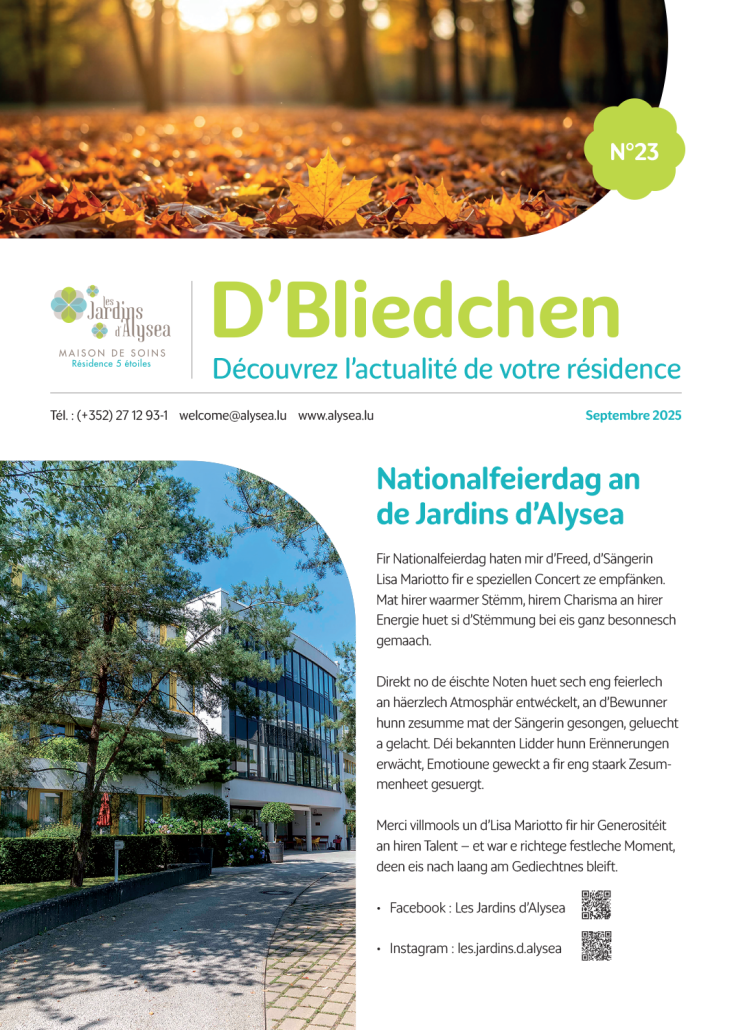 De construction récente, notre maison jouit de tout le confort moderne et dispose de tous les équipements dont vous avez besoin. Au sein d’un beau jardin, la maison de retraite est blottie dans le village de Crauthem. Cet environnement idéal vous garantit calme, quiétude et sécurité. À quelques minutes de Luxembourg-ville, cette situation offre aux séniors de nombreuses opportunités culturelles, sociales, de loisirs…